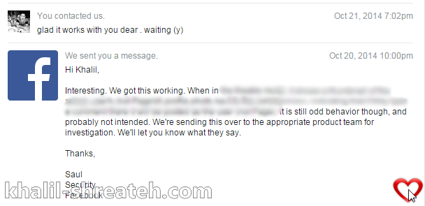 في غضون أيام قليلة، أصلحت فيسبوك الثغرة، وتلقيت رسالة شكر منهم على جهودي. كجزء من برنامج المكافآت، حصلت على جائزة مالية قدرها 500 دولار تقديرًا لمساهمتي في حماية المنصة.